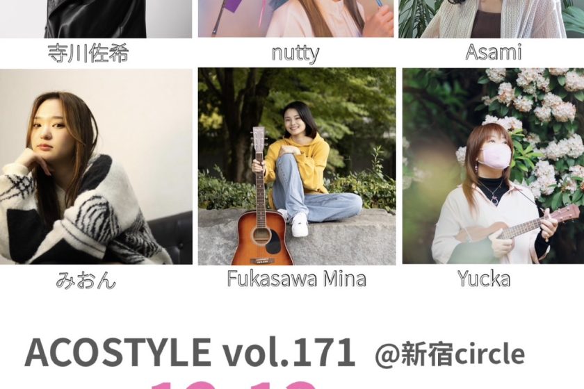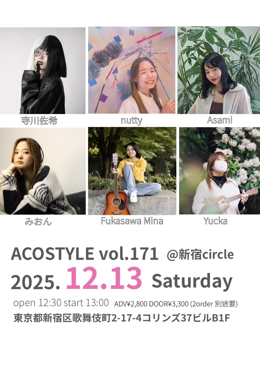 【昼の部】ACOSTYLE vol.171 12月 13 Sat 2025 CIRCLE 【時間】 open 12:30 / start 13:00 【料金】 ADV¥2,800 DOOR¥3,300 (2order 別途要) 【出演】 寺川佐希 nutty Asami みおん Fukasawa Mina Yucka ---------- 【STAFF】MIsaki・綾人 チケット予約 前のスケジュール 次のスケジュール