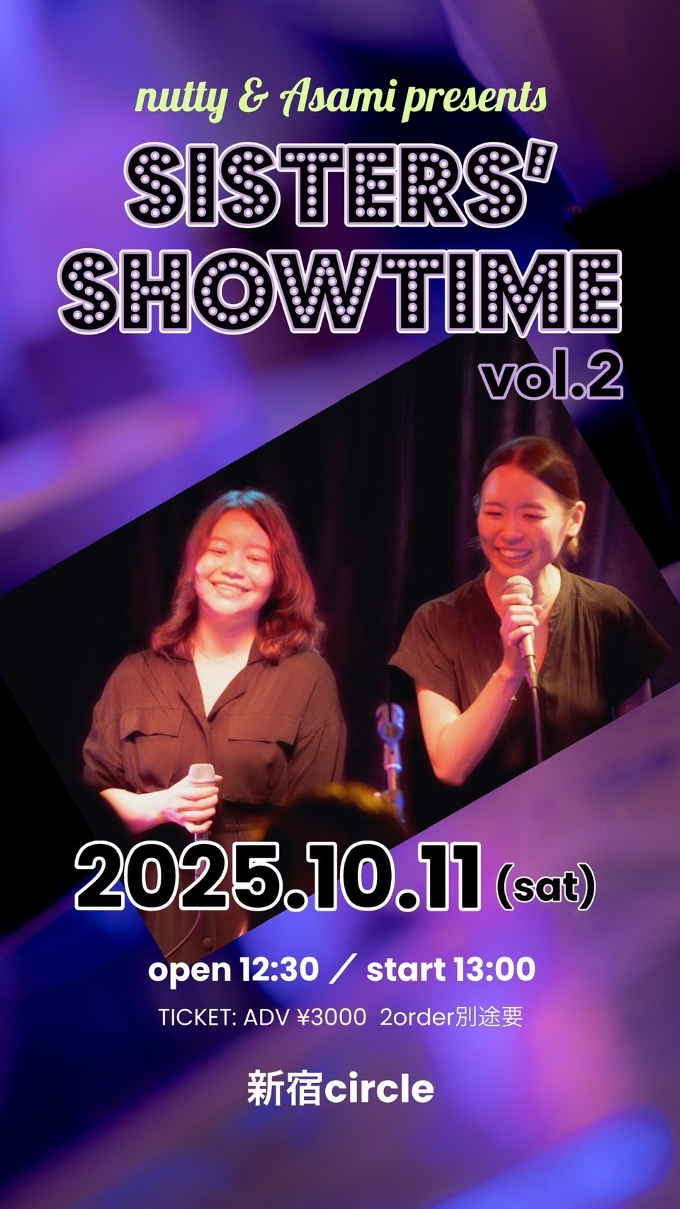 nutty & Asami presents SISTERS’ SHOWTIME vol.2 10月 11 Sat 2025 CIRCLE 【時間】open 12:30 / start 13:00 【料金】charge ¥3,000(2order 別途要) 【出演】nutty・Asami 中村康宏(gt) ---------- 【STAFF】雑賀・イエ チケット予約 前のスケジュール 次のスケジュール