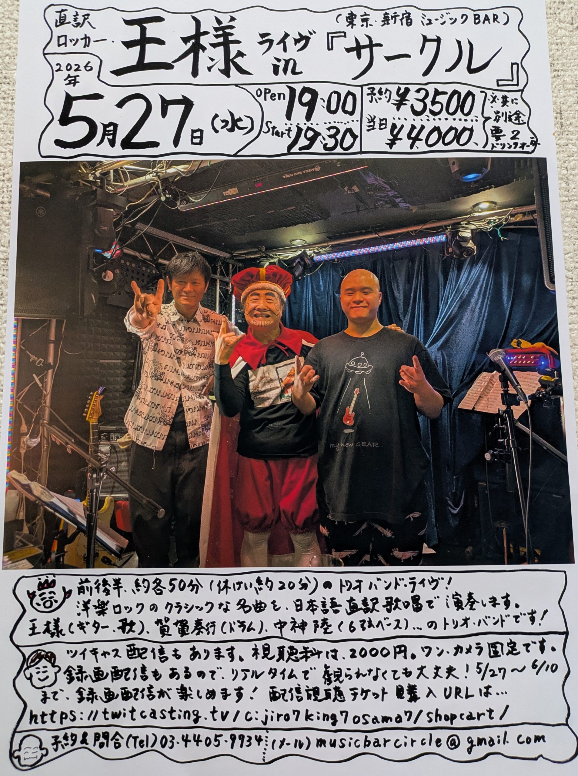 王様 5月 27 Wed 2026 CIRCLE 【内容】洋楽ロックの名曲を日本語に翻訳して歌い、ギターを弾く知る人ぞ知る王様! ここサークルならではの FUNKY SOMKE ON THE WATERなども聴くことができますよ! 【OPEN】 19:00 【START】 19:30 【CHARGE】 ・前売り 3,500円(+要2オーダー) ・当日 4,000円(+要2オーダー) ※23歳以下の方は、1オーダーのみでも可 ---------- 【STAFF】綾人・あい チケット予約 前のスケジュール 次のスケジュール