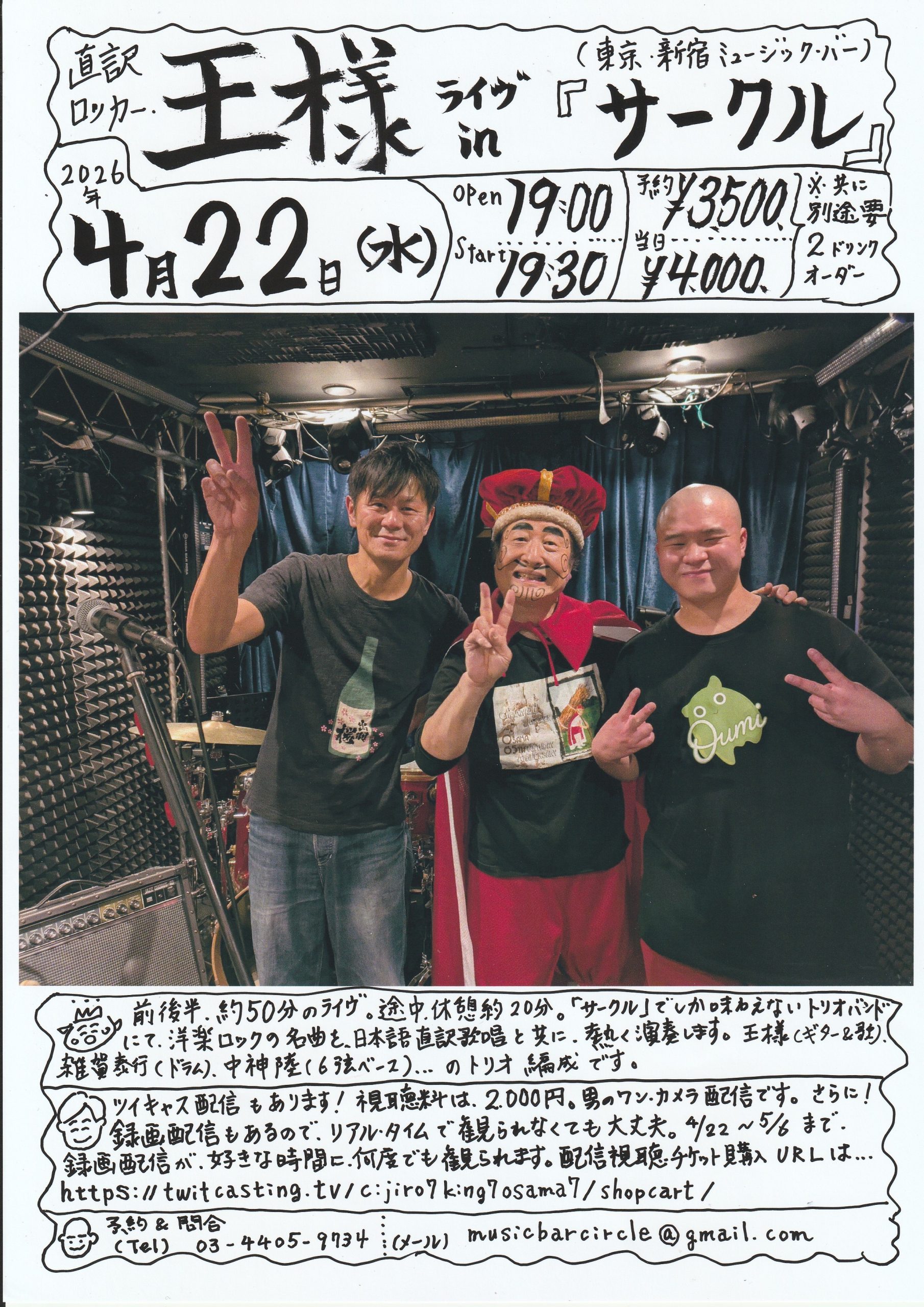 王様 4月 22 Wed 2026 CIRCLE 【内容】洋楽ロックの名曲を日本語に翻訳して歌い、ギターを弾く知る人ぞ知る王様! ここサークルならではの FUNKY SOMKE ON THE WATERなども聴くことができますよ! 【OPEN】 19:00 【START】 19:30 【CHARGE】 ・前売り 3,500円(+要2オーダー) ・当日 4,000円(+要2オーダー) ※23歳以下の方は、1オーダーのみでも可 ---------- 【STAFF】Misaki・イエ チケット予約 前のスケジュール 次のスケジュール