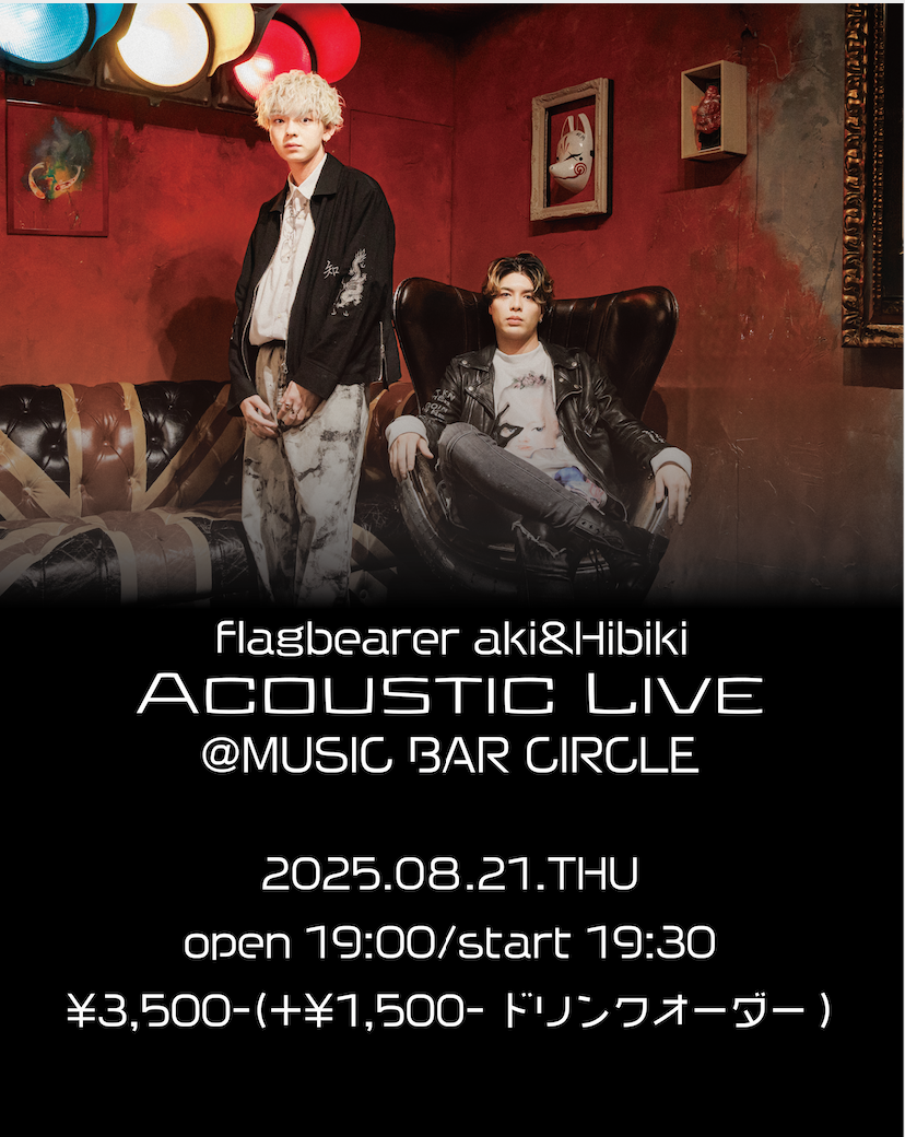flagbearer AKI & Hibiki Acousutic LIVE 8月 21 Thu 2025 CIRCLE 【OPEN】 19:00 【START】 19:30 【CHARGE】 2,500円(+要1,500円以上オーダー) ※23歳以下の方は、1オーダーのみでも可 ---------- 【STAFF】JuuN・イエ チケット予約 前のスケジュール 次のスケジュール