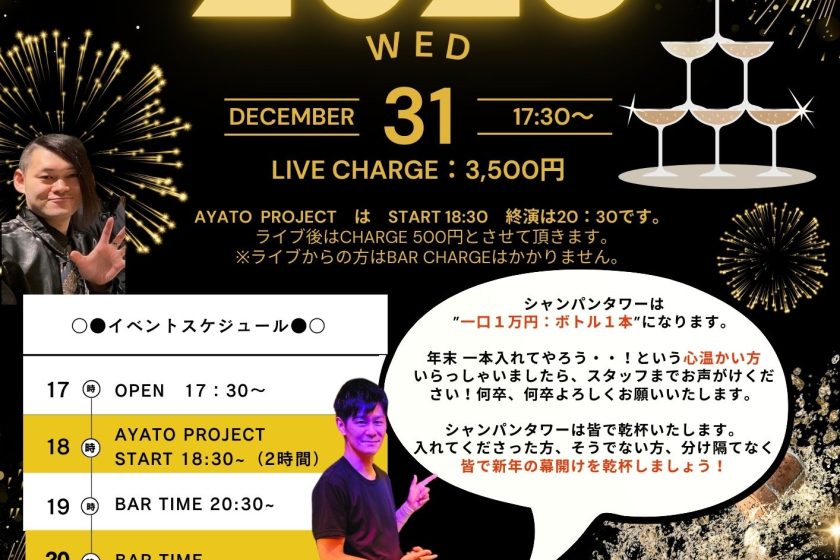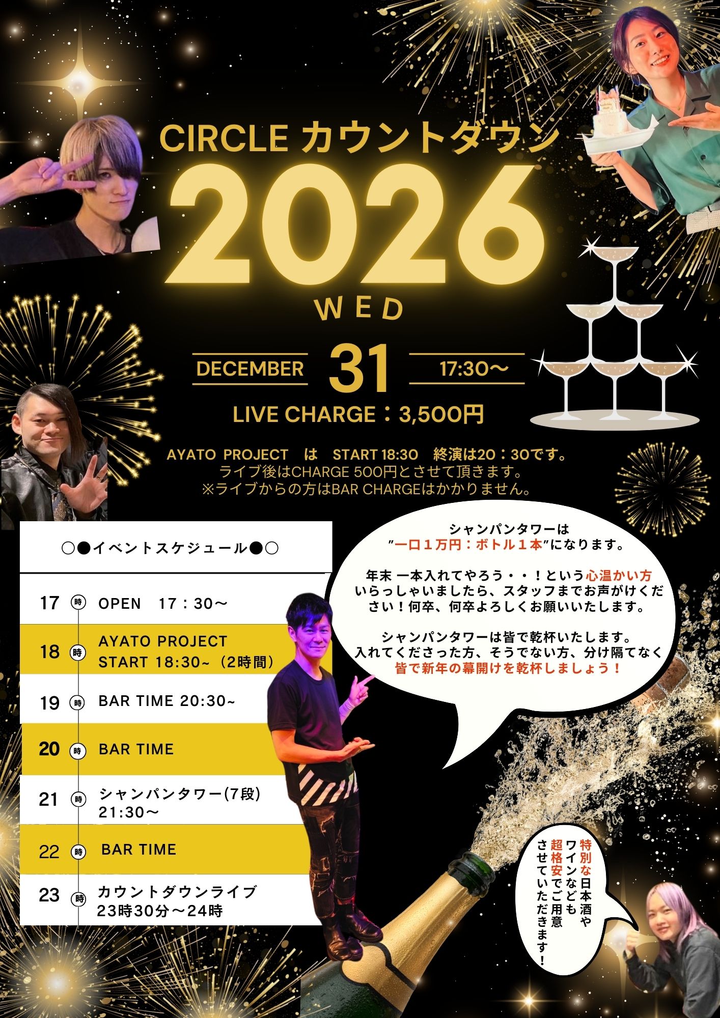 CIRCLE COUNT DOWN SP 12月 31 Wed 2025 CIRCLE 【カウントダウンライブ!】 シャンパンタワー 21時スタート Start 23時30分~24時 【Member 】 Vo Misaki Dr 雑賀泰行、JuuN Ba 河本奏輔、イエ Gt 綾人 チケット予約 前のスケジュール 次のスケジュール