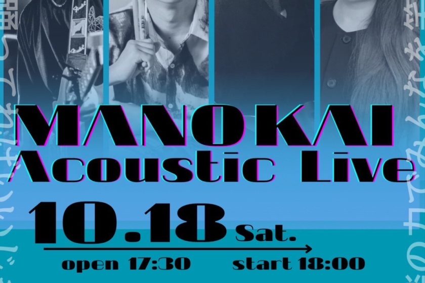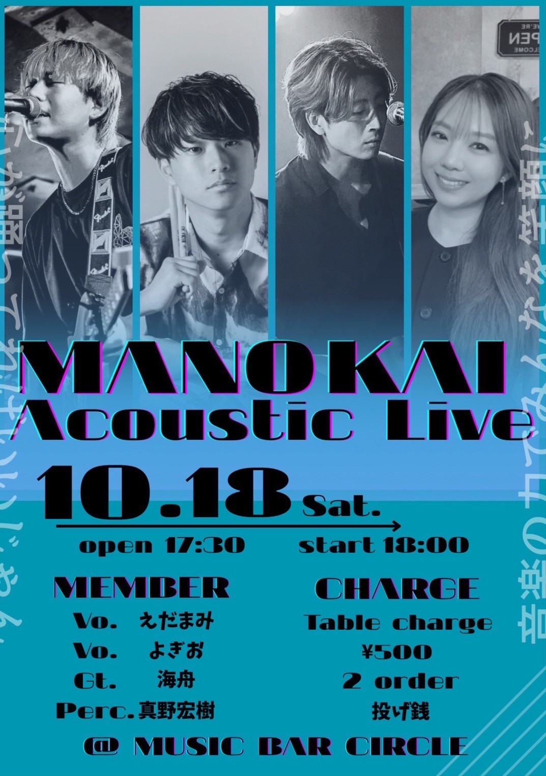 MANOKAI Acoustic Live 10月 18 Sat 2025 CIRCLE 【OPEN】 17:30 【START】 18:00 【CHARGE】500円(+要2オーダー) ※23歳以下の方は、1オーダーのみでも可 【MEMBER】 Vo えだまみ・よぎお Gt 海舟 Per 真野宏樹 チケット予約 前のスケジュール 次のスケジュール