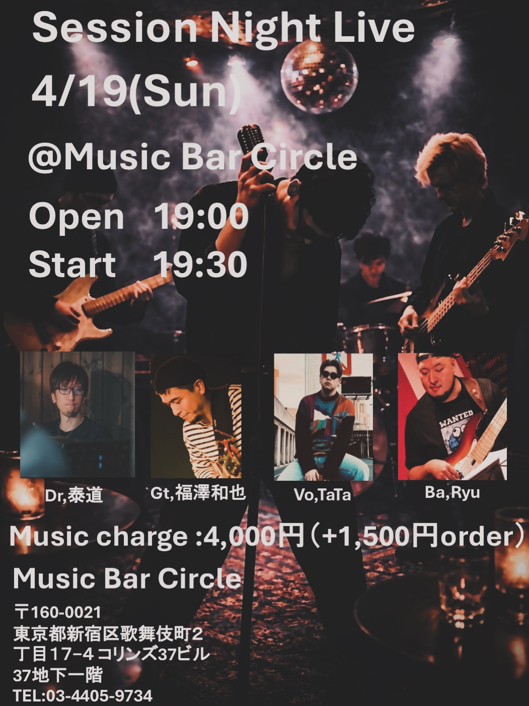 Session Night Live 4月 19 Sun 2026 CIRCLE 【OPEN】 19:00 【START】 19:30 【CHARGE】4000円+1500円ORDER 【MEMBER】 Dr 泰道 Gt 福澤和也 Vo TaTa Ba Ryu ---------- 【STAFF】イエ・JuuN [caption id="attachment_4663" align="alignnone" width="1051"] Screenshot[/caption] チケット予約 前のスケジュール 次のスケジュール