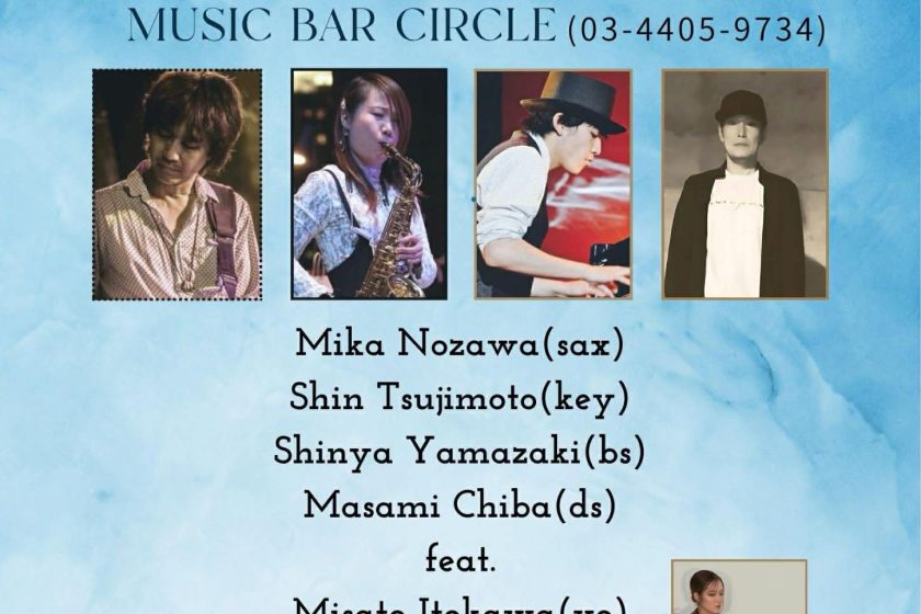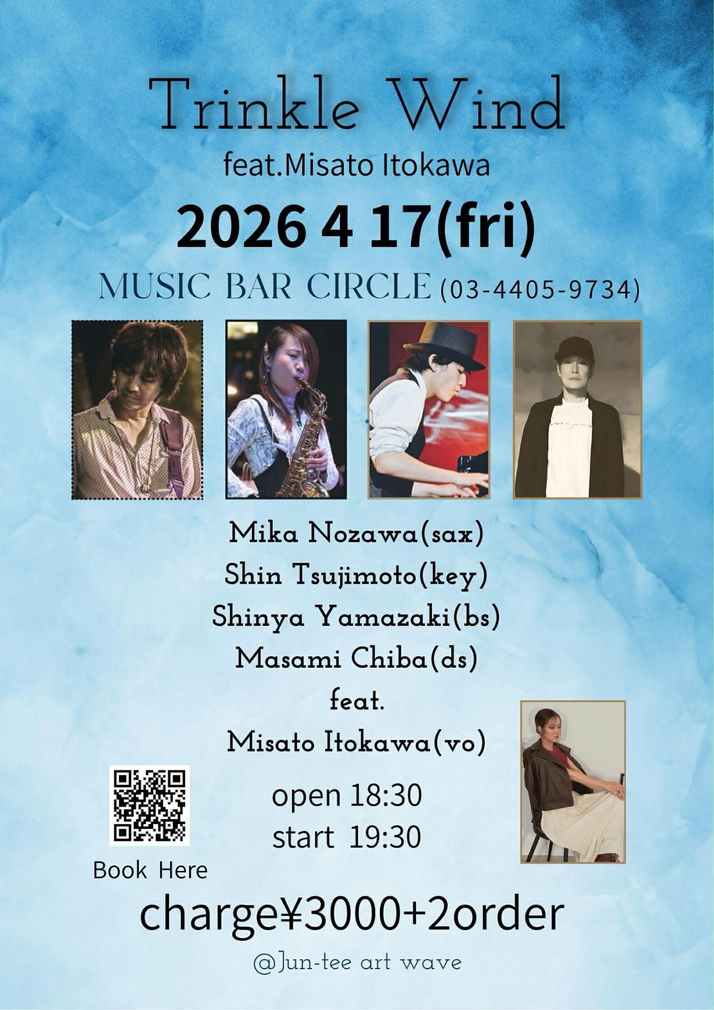 Trinkle Wind feat.Misato Itokawa 4月 17 Fri 2026 CIRCLE 【open】 18:30 【start】 19:30 【charge】¥3000+2order 【Member】 Mika Nozawa(sax) Shin Tsujimoto (key) Shinya Yamazaki (bs) Masami Chiba(ds) feat. Misato Itokawa(vo) ---------- 【STAFF】イエ・JuuN チケット予約 前のスケジュール 次のスケジュール