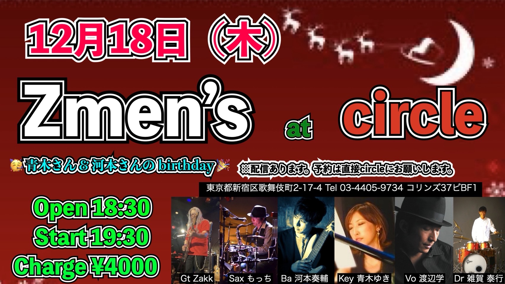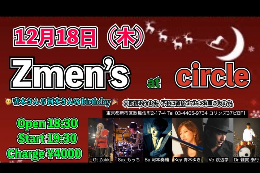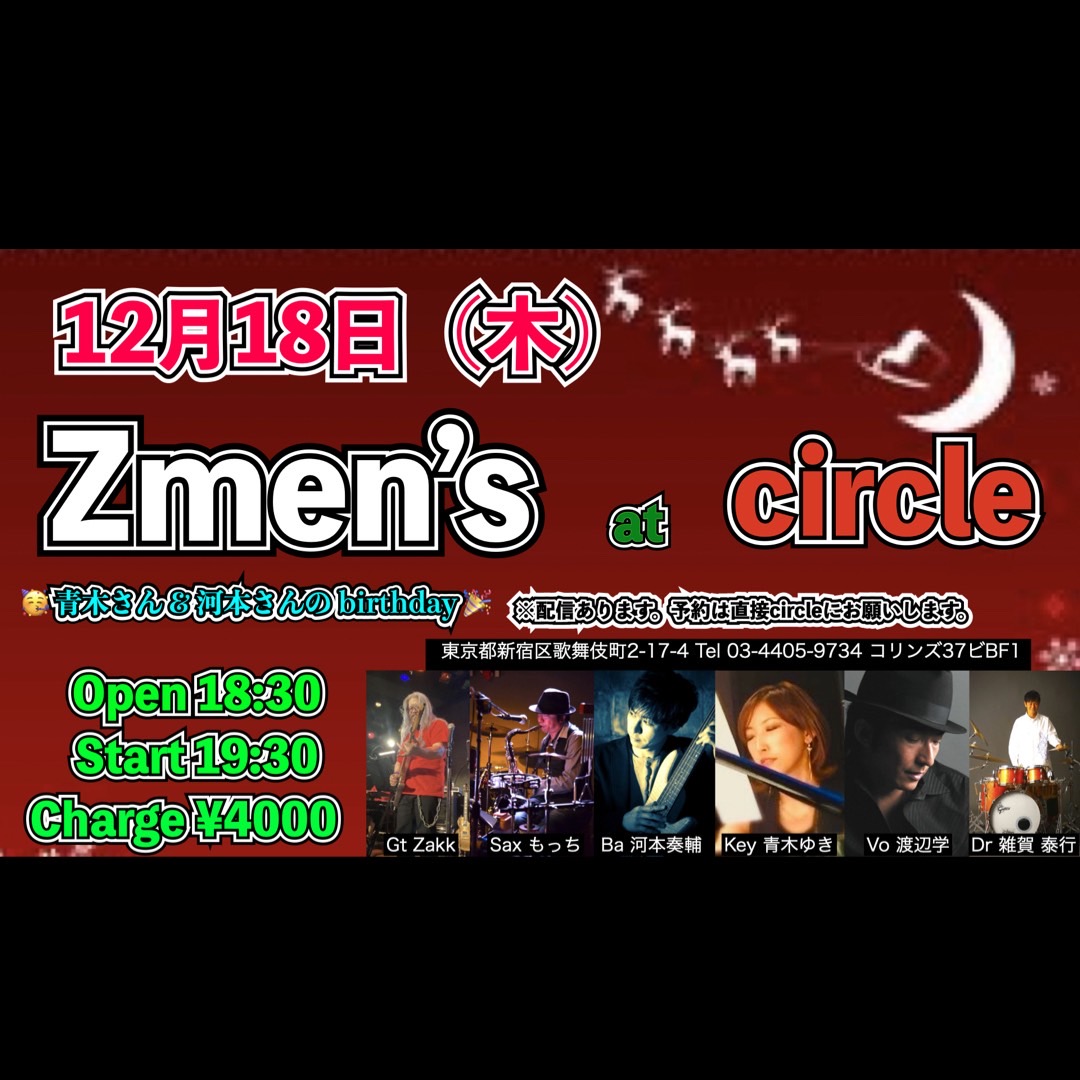 Zmen’s 青木さん&河本さんBirthday Live 12月 18 Thu 2025 CIRCLE 【OPEN】 18:30 【START】 19:30 【CHARGE】4000円 【MEMBER】 Gt Zakk Sax もっちー Ba 河本奏輔 Key 青木ゆき Vo 渡辺学 Dr 雑賀泰行 ■配信チケット販売ページはこちら↓ 準備でき次第告知させていただきます ---------- 【STAFF】JuuN・イエ チケット予約 前のスケジュール 次のスケジュール