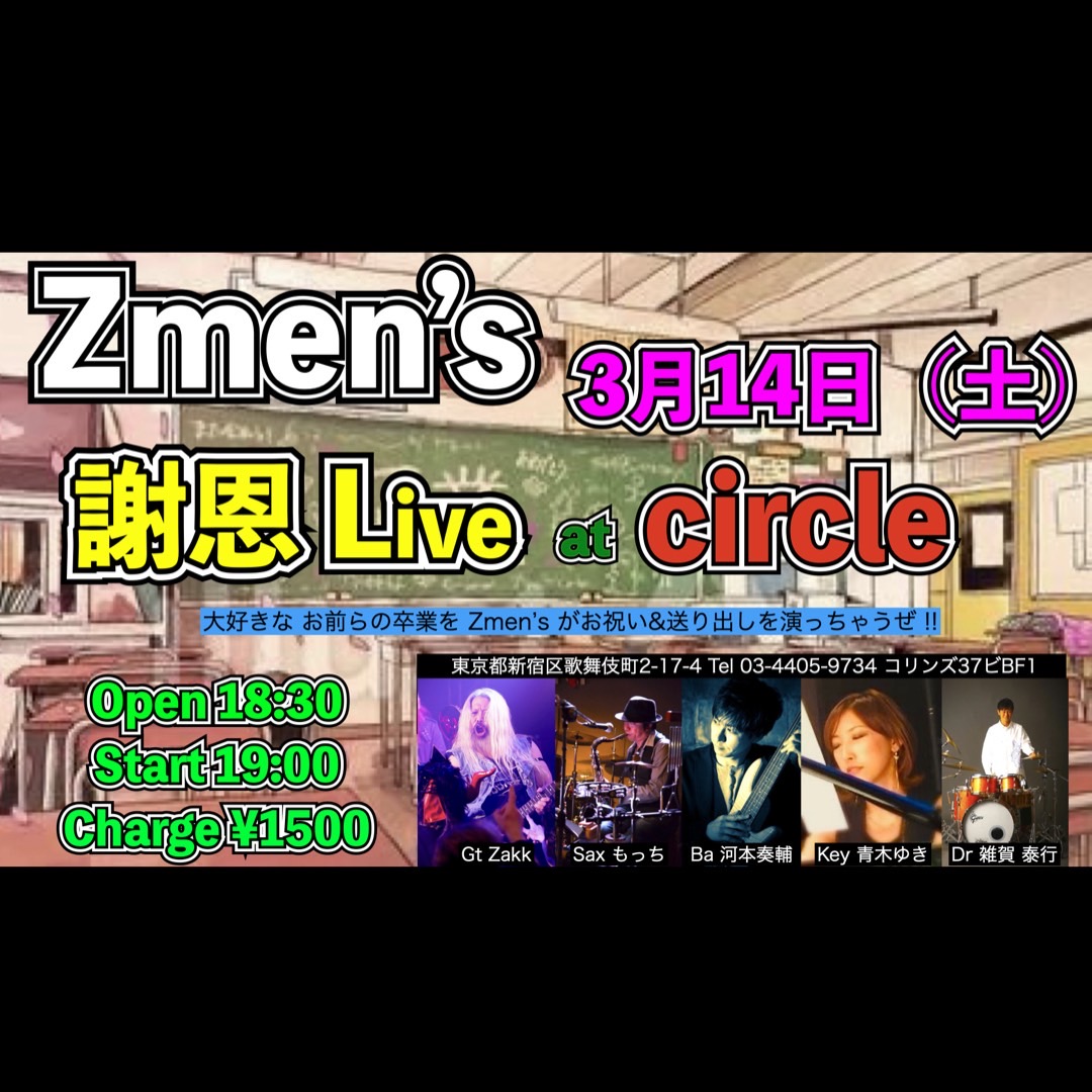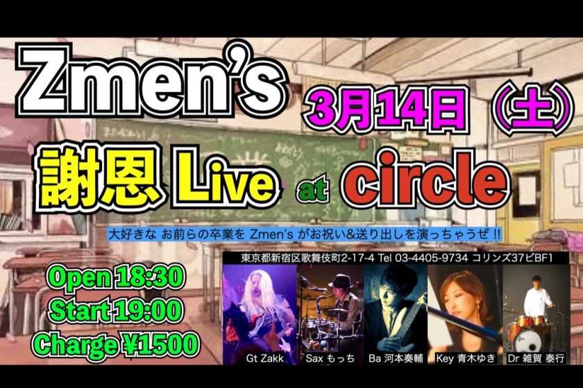 Zmen’s 3月 14 Sat 2026 CIRCLE 【OPEN】18:30 【START】19:00 【CHARGE】1500円 【member】 Gt Zakk Sax もっち Ba 河本奏輔 Key 青木ゆき Dr 雑賀泰行 チケット予約 前のスケジュール 次のスケジュール